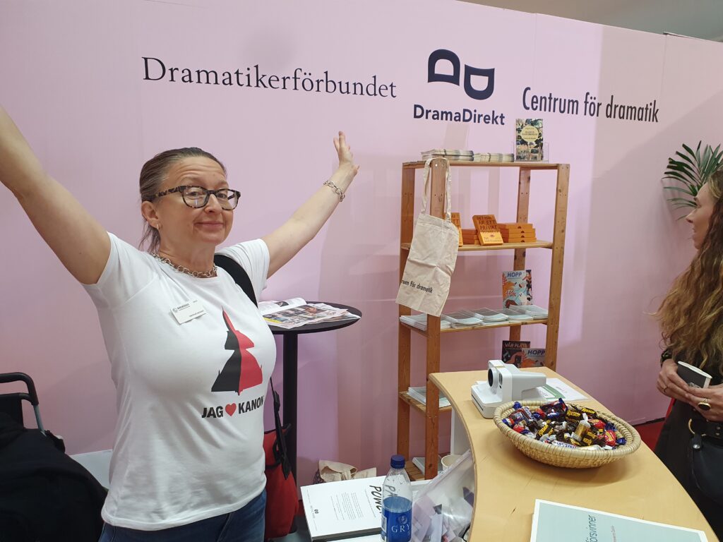 I år fick dramatiken plats på mässgolvet i Göteborg, och mitt teaterförlag Colombine hade tillsammans med alla sina samarbetspartner skapat ett lysande seminarieprogram. Dramatikerförbundet var på plats förstås, här ser ni vice ordförande Gertrud Larsson i montern.