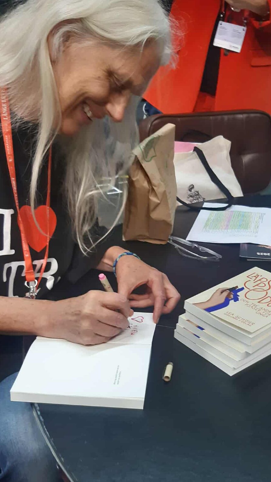 Förstås inte. Man ska väl komma hem med böcker ifrån bokmässan, och i år kom jag också hem med de första exemplaren av min egen pjäsbok. Så här glad var jag när Elsa köpte och ville ha en signatur.